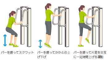 健康寿命の延伸につながるロコモ予防を目的とした下肢運動ができる製品です。軽めのスクワットやかかと上げ、片足上げなどの運動が行えます。