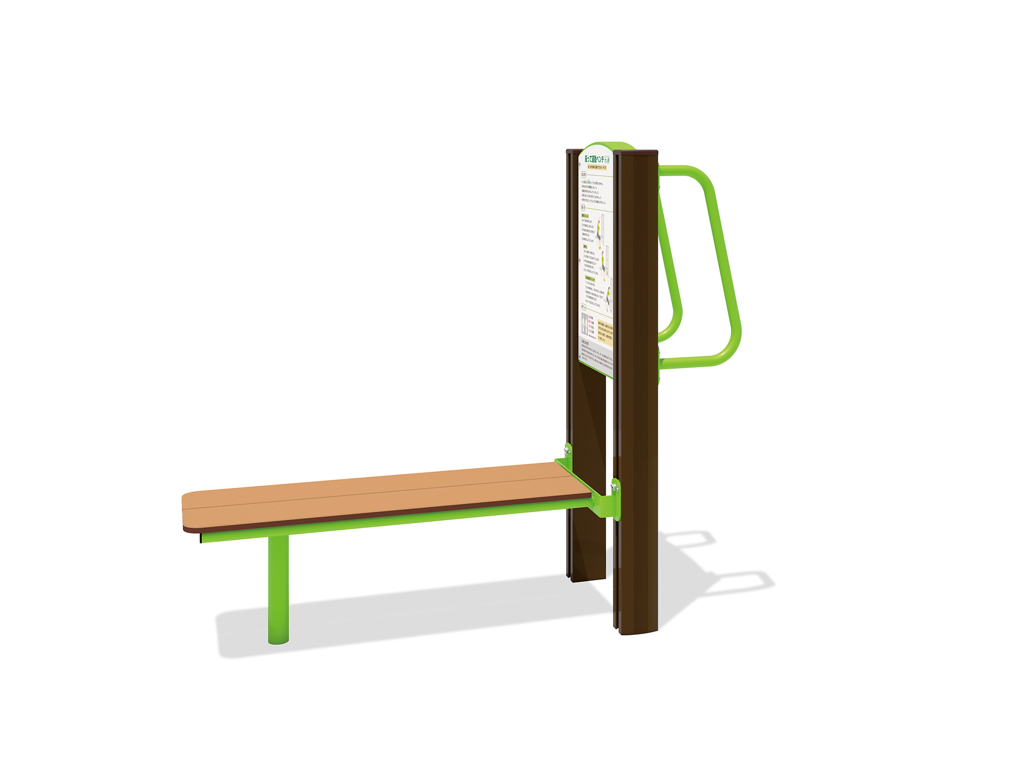 座った状態で楽に様々な運動ができます。ベンチは1200mmの長さで、運動だけでなく休憩や団らんとしても使うことができる汎用性が高い製品です。